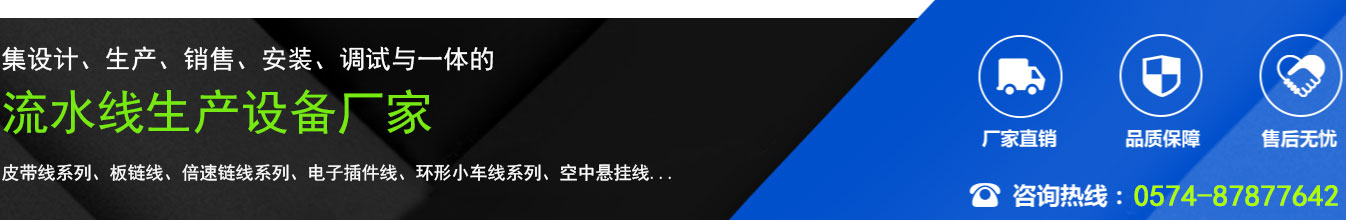 是一家集開發(fā)、設計生產、營銷、安裝、調試與一體的寧波流水線生產廠家。產品有:皮帶線系列、板鏈線、倍速鏈線系列、電子插件線、環(huán)形小車線系列、空中懸掛線、動力滾筒線、無動力滾筒線系列、皮帶線彎道、無動力裝配工作臺以及各種非標配套設備.